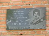 - на будинку, де мешкала Раїса Кириченко, працюючи у Полтавській обласній філармонії 13 жовтня 2005 року було встановлено меморіальну таблицю співачці;[2]