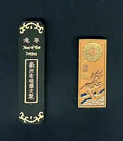 Бруски туші часто художньо оформляються. Дорогі сорти додатково поміщаються в спеціальні футляри з цінних порід дерева, оброблених шовком.