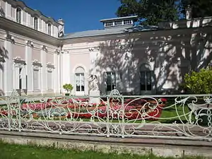 Палац побудували поблизу ставка поряд з перголою та двома павільйонами та наскрізною колонадою. Разом вони утворювали невеликий симетричний ансамбль зі ставком в центрі. Стежками ансамбль поєднувався з окремими і віддаленими будівлями Оранжереї, кавалерського корпусу і кухні (палац не мав власної кухні). Фасади палацу — досить стримані, прикрашені вікнами, неглибокими нішими та великими дверима. На північному фасаді — гранчата напівротонда та круглі вікна для кращого освітлення інтер'єру.