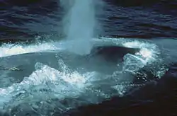 У спокійному стані тримається під водою 10 — 12 хвилин. Після глибокого занурення на поверхні з'являється зазвичай верхівка голови з дихальцем. Викинувши фонтан води, синій кит поволі й плавно згинає широку спину. Мініатюрний спинний плавник з'являється, коли голова і передня частина спини вже ховаються під водою. Кит інколи виставляє хвостовий плавник у формі півкола.