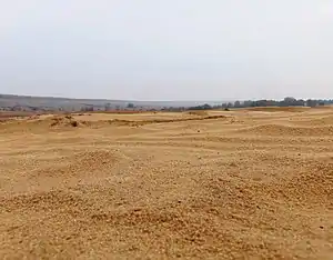 Напівпустельні ландшафти утворені алювіальними піщаними відкладеннями річки Сіверський Донець, що нагадують дюни. У минулому на цьому місці був танковий полігон, що використовувався в 1960-1990-ті роки[1][2]. З тих часів залишилися танкові снаряди, що не вибухнули[2]. Піщані пагорби частково поросли мохами, лишайниками, чагарниками і травою[1].
