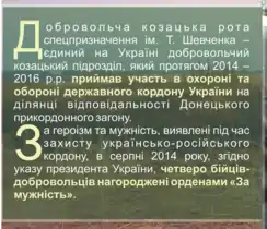 Добровольча козацька рота спецпризначення ім. Т.Шевченка з кінця 2015 по 2019 рр. виконує бойові завдання в зоні проведення АТО в Донецькій обл. на ділянці відповідальності Донецького прикордонного загону.