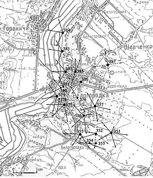 | № 20 | с. Білогородка | 19 | 351 (кулемет., тип «М3»), 352 (кулемет., тип «М2»), 353 (кулемет., тип «МС»), 354 (кулемет., тип «МС»), 355 (кулемет., тип «М2»), 356 (кулемет., тип «М2»), 357 (кулемет., тип «М3»), 376 (кулемет., тип «Барбет»), 377 (кулемет., тип «М2»), 378 (кулемет., тип «Барбет»),379 (кулемет., тип «М2»), 380 (кулемет., тип «Барбет»), 381 (кулемет., тип «Барбет»), 382 (кулемет., тип «М2»), 383 (кулемет., тип «М2»), 384 (кулемет., тип «М2»), 385 (кулемет. капонір, тип «М2»/«М3»), 386 (кулемет., тип «М3»), 387 (кулемет. тип «М2»/«М3»), | ![]() |