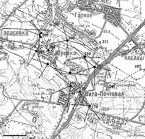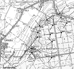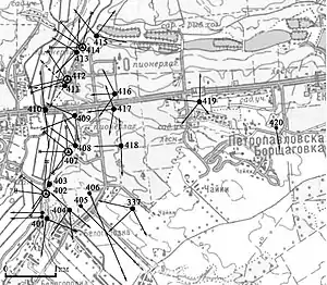 | № 14 | с. Мриги — с. Конча-Заспа | 9 | 101 (кулемет., тип «М2»), 102 (кулемет., тип «М2»), 103 (кулемет., тип «М2»), 104 (кулемет., тип «М2»), 105 (кулеме., тип «М2»), 106 (кулемет., тип «М2»), 107 (кулемет., тип «М2» з бронековпаком ВСУ), 108 (кулемет., тип «М2»), 109 (кулемет., тип «М2») | ![]() |