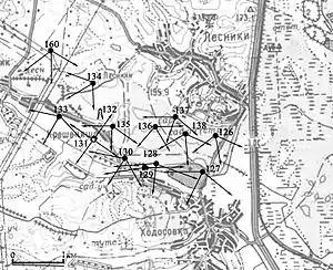 | № 8 | с. Кременище — с. Лісники | 14 | 126 (кулемет., тип «М2»), 127 (кулемет., тип «Б»), 128 (кулемет., тип «М1»), 129 (кулемет. капонір, тип «М2»), 130 (кулемет., тип «Б»), 131 (кулемет., тип «Б» з бронековпаком ВСУ), 132 (спостер. вежа «Ажур»), 133 (кулемет., тип «Б»), 134 (кулемет., тип «М2»), 135 (кулемет., тип «М2»), 136 (кулемет., тип «М2»), 137 (кулемет., тип «М2»), 138 (кулемет., тип «М2»), 160 (кулемет., тип «М1») | ![]() |