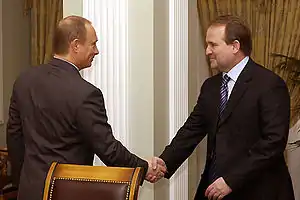 - Віктор Медведчук є кумом Володимира Путіна, який хрестив його доньку Дарину[16] та реалізовує його політику в Україні, зокрема через свою політичну організацію «Український вибір»