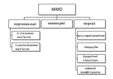 - МКМД - комп'ютерні системи з множинним потоком команд та множинним потоком даних (MIMD - Multiple Instruction Multiply Data stream).