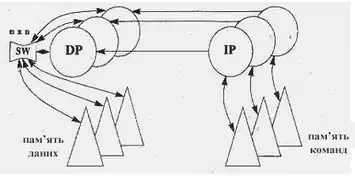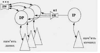 - ієрархія пам'яті (IM - Instruction Memory, DM - Data Memory) - запам'ятовувальний пристрій, в якому зберігаються дані та команди, що пересилаються між процесорами;