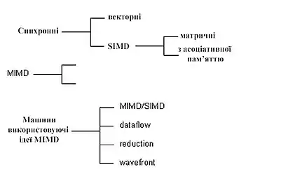 По суті, систематика дуже проста: процесори системи працюють або синхронно, або незалежно один від одного, або в архітектуру системи закладена та чи інша модифікація ідеї MIMD. На наступному рівні відбувається деталізація в рамках кожного з цих трьох класів. Дамо невелике пояснення лише до тих з них, які на сьогоднішній день не настільки широко відомі.