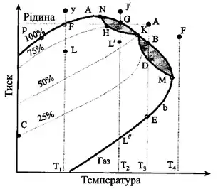Типова фазова діаграма багатокомпонентної суміші (рис.) в координатах тиск–температура має петлеподібний вид, тобто відрізняється від відповідної фазової діаграми чистої речовини, яка зображується у вигляді однієї монотонно зростаючої, увігнутої до осі температур кривої з однією кінцевою (критичною) точкою. На діаграмі (рис.) крива точок кипіння «а» — межа однофазного рідкого і двофазного парорідинного станів, а крива точок роси «b» — межа однофазного газоподібного і двофазного парорідинного станів. Ці криві сходяться в критичній точці К.