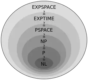 Відомо, що в першому і другому рядках наведених відношень між класами, принаймні одне відношення вкладення має бути строгим, але невідомо, котре. Досить імовірно, що всі ці відношення є строгими. Для обох відношень вкладення третього рядка точно відомо, що вони строгі. Перше випливає з прямої діагоналізації (теорема про ієрархію місця) і факту PSPACE = NPSPACE. Друге випливає з теореми про ієрархію місця.