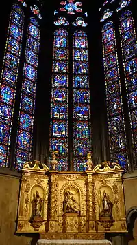 На вітражах хорів зображені сцени з життя святих, яким присвячені каплиці собору. Вітражі слід читати знизу вгору та зліва направо.