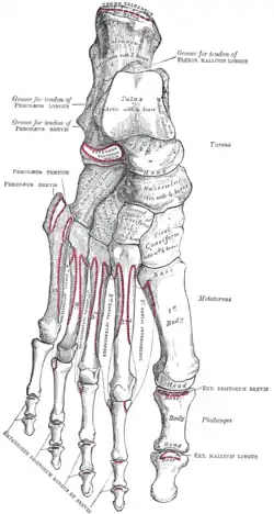 Кістки правої стопи. Дорсальна поверхня. Малюнок з «Анатомії Грея»