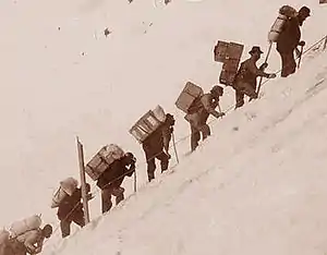 Перші пароплави до Валдізу прибули восени. Погодні умови під час плавання були настільки нестерпні для тварин, що ще на пароплаві довелося застрелити майже всіх собак, коней, мулів та віслюків[70]. Величезний льодовик між портом і горами робив цей маршрут майже непрохідним. До перевалу потрібно було долати 32 км на висоті 1,6 км[70]. На деяких ділянках лише з допомогою канатів і блоків можна було витягнути нагору вантаж[70]. Холод та хвороби забрали життя багатьох мандрівників[71].