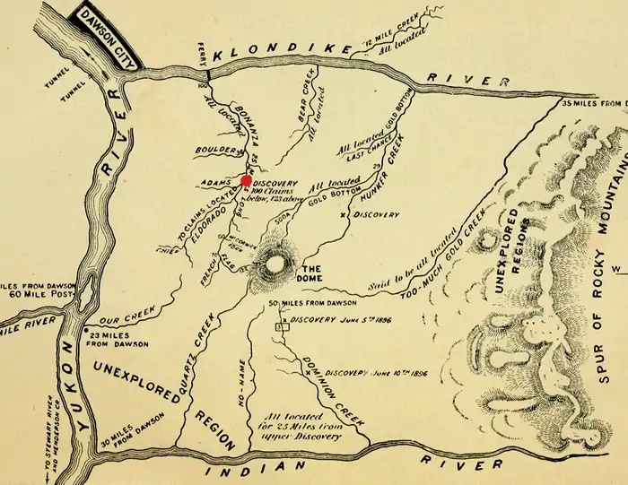 У серпні 1896 року група людей на чолі з Джимом Мейсоном Скукумом, представником місцевого племені, та Джорджом Кармаком, який в основному займався риболовлею і сплавлянням лісу до містечка Форті-Майл, подорожуючи вниз за течією Клондайка, вирішила спробувати свого щастя в старательстві на безіменній притоці річки Раббіт[14]. 16 серпня 1896 року група Кармака провела перший намив, який залишив на дні 12,5 грамів золота — на 4 долари в тодішніх цінах (намив золота на 10 центів на Юконі у той час вважався хорошим результатом). Дуже швидко вони наповнили золотим піском і самородками порожню сумку з-під набоїв[15], яка слугувала їм доказом їхньої розповіді про відкриття нової золотої жили. Як першовідкривач, Джордж Скукум мав право застовпити собі дві ділянки. По одній ділянці отримали і двоє членів його групи[15]. Кожна ділянка, за тодішніми законами, простягалася на 500 футів (150 м) за руслом річки і завширшки — до найближчих гір. Ширина ділянки не мала великого значення, оскільки золото залягало завжди безпосередньо в руслах. Річку Раббіт перейменували в Бонанза, а її безіменну притоку назвали «Ельдорадо»[15].