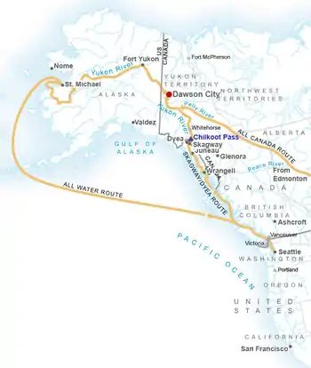 Більшість золотошукачів вдавалися до подорожі кораблем до портових міст Скагвей або Даї, які розташовані над каналом Лінн на західному узбережжі Аляски, потім — пішки 53 км по Чилкутському шляху, долали Береговий хребет та прямували або Чилкутським перевалом, або перевалом Вайт до озер Беннет або Ліндман, які знаходилися вже в провінції Британська Колумбія[57]. Далі — на човнах і плотах до самого Клондайку. Уздовж усього Юкону, від озера Беннет до Доусон-Сіті, береги річки були всіяні наметами шукачів, які зупинялися на перепочинок і ремонт[58][59].