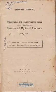 - Зеньковский летописец. Общественная самодеятельность при учреждении Зеньковской мужской гимназии (1904—1914 гг.). — Зеньков: тип. Г. Подземского, 1915. — 40 с.(рос.)