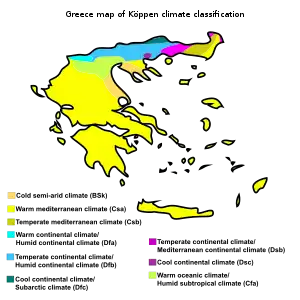 Клімат материкової частини Греції подібний із кліматом Балканського регіону в цілому — із холодними зимами і жарким вологим літом. Аттика, центральні і східні райони Пелопоннесу, Крит, острови Кіклад і Додеканесу відрізняються типовим середземноморським кліматом зі спекотним і сухим літом та водночас прохолодною зимою. На Криті найдовше зберігається тепла погода[2].