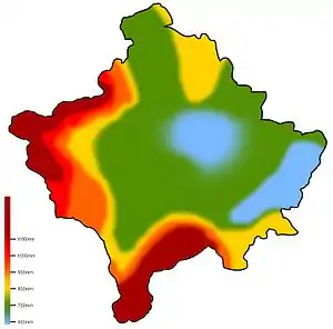 Кліматична область долини річки Ібар знаходиться під впливом континентальних повітряних мас. З цієї причини в цій частині регіону більш холодні зими з середніми температурами близько -10 °C, іноді до -26 °C. Літо дуже спекотне, з середньою температурою 20 °C, іноді до 37 °C. Цей район характеризується сухим кліматом і загальньо річною кількістю опадів близько 600 мм на рік. Кліматична область Метохії, яка включає басейн річки Білий Дрин, сильно залежить від мас гарячого повітря, які приходять з Адріатичного моря. Середня температура взимку коливається від 0,5 °C до іноді 22,8 °C. Середньорічна кількість опадів у цій кліматичній області близько 700 мм. Зима характеризується сильними снігопадами. Кліматична область гірських і лісових регіонів характеризується типовим лісовим кліматом, який пов'язаний з рясними опадами (від 900 до 1300 мм на рік), а також влітку, яке дуже коротке й холодне, і зимами, які в основному холодні і з великою кількістю снігу. Територія Косово характеризується сонячним кліматом зі змінною температурою і вологістю[2].