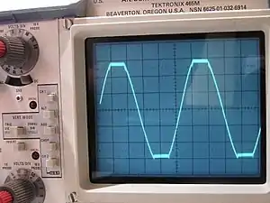 Кліппінг на екрані осцилографа. Замість чистої гармонічної хвилі спостерігається обмеження синусоїди зверху і знизу.