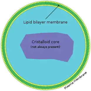 Ліпідний бішар біологічних мембран має товщину 5 нм[42] і в основному побудований із фосфоліпідів, у молекулах яких виділяють дві основні частини: гідрофільну «голову» (залишок фосфатної кислоти і холіну, серину, етаноламіну або іншої полярної сполуки) та два гідрофобні «хвости» (залишки жирних кислот). У складі бішару гідрофільні голови фосфоліпідів повернуті назовні — у полярний водний розчин, а гідрофобні хвости — всередину. До складу мембран у меншій кількості входять також інші ліпіди, такі як гліколіпіди, сфінголіпіди та холестерол[43].