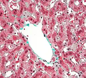 Клітини Купфера з сірою зернистою цитоплазми в ураженій печінки. Біопсія печінки. Триколірне забарвлення.