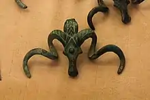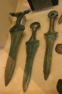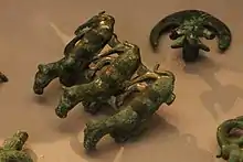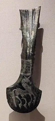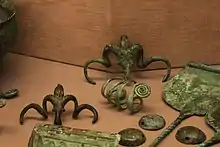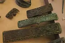 - бронзові сокири витонченої форми, поясні пряжки, фібули, браслети, налокітники й інші предмети, прикрашені геометричним орнаментом і зображеннями тварин;