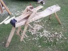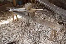 Майстер здійснює стругання, сидячи верхи на лаві, поклавши заготовку на опорну дошку і впираючись ногами в нижню перекладку хитної балки, при цьому її «голова» притискує заготовку до дошки. Ножний затискач надійно утримує заготовку проти тягових зусиль, що особливо важливо при роботі скобелем[3][4][5].