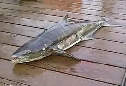 Загальна довжина сягає 2 м при максимальній вазі 78 кг. Має довге, в формі шпинделя форму з широкою пласкою головою. Очі маленькі. Нижня щелепа трохи більше верхньої, виступає трохи вперед. Тулуб гладенький. Грудні плавці розташовано горизонтально, що робить їх схожими на акул. Спинний плавець добре розвинений, гострий шипастий, складається з 3 жорстких та 26-33 м'яких променів. Анальний плавник трохи коротше — 2-3 жорстких і 22-28 м'яких променів. Хвостовий плавець має форму півмісяця, з трохи довшою верхньою лопаттю.