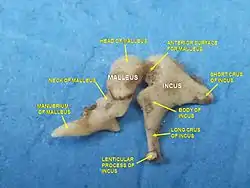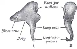 ![]() Коваделко лівого вуха на малюнку з Анатомії Грея: A — вигляд зсередини, B — спереду. Частини коваделка: тіло (body), коротка ніжка (short crus), довга ніжка (long crus), передня поверхня (facet for malleus), сочевицеподібний виросток (lenticular process) | |