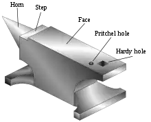 - Хвостова частина ковадла виготовляється у вигляді виступу з прямими кутами для гнуття заготівок під прямим кутом.