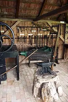 Необхідними елементами обладнання кузні є горно, ковальський міх і балія з водою — для гартовування готових виробів.