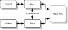 Коли клієнти в системі використовують кешування загальних ресурсів, наприклад, пам'яті, можуть виникнути проблеми з суперечливістю даних. Це особливо справедливо по відношенню до процесорів в багатопроцесорній системі. На малюнку «Кеш для ресурсу пам'яті» зображено, що клієнт у верхній частині має копію блоку пам'яті з попереднього читання, а нижній клієнт змінює блок пам'яті, копія даних в кеші верхнього клієнта стає застарілою, якщо не використовуються будь-які повідомлення про зміну або перевірки змін. Когерентність кешу призначена для управління такими конфліктами і підтримкою відповідності між різними кешами.