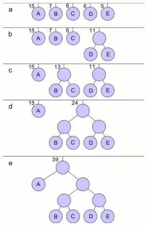 - Символи вхідного алфавіту утворюють список вільних вузлів. Кожен лист має вагу, яка може бути рівною або ймовірності, або кількості входжень символу у стиснене повідомлення.