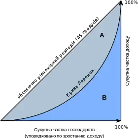 Якщо весь дохід є рівномірно розподілений, то крива Лоренца збігається з прямою повної рівності і значення коефіцієнта Джині рівне нулю.