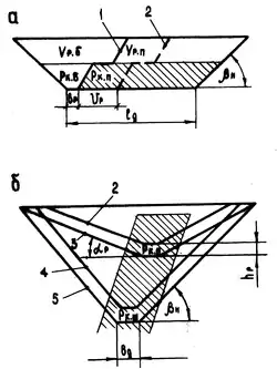 Схема до розрахунку середньоексплуатаційного і поточного коефіцієнтів розкриву для пологих (а) та поточного і контурного – для похилих та крутоспадаючих покладів (б): 1– контур кар'єра при закінченні будівництва; 2–річне переміщення фронту робіт р (м); 3–річне пониження фронту робіт hр (м); 4,5 – змінення граничного контура кар'єрного поля.