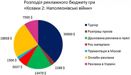 Рекламний бюджет гри «Козаки II: Наполеонівські Війни» склав 78 тисяч доларів[3]. Оскільки „Козаки“ — це національний продукт, тому від початку планувалося витратити певний об'єм коштів на рекламу в Україні, вона була представлена величезним відеобордом на вулиці, рекламою в Київському метро, а також презентацією для журналістів. Усього бюджет розробки гри становить 750 тисяч доларів[4].