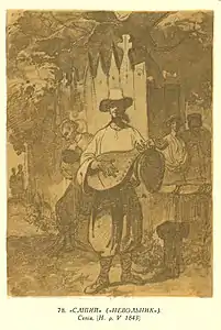 Олексій Новицький, використовуючи, лише, каталог лебединської виставки, який не мав ілюстрацій, помилково відніс цей малюнок до творів авторство яких приписується Тарасу Шевченку. На його думку, у каталозі йшлося про офорт Василя Штернберга — «Кобзар з поводирем», який був фронтиспісом до першого видання «Кобзаря»[14][7].
