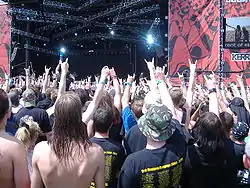 Популяризований вокалістом Ронні Джеймс Діо, який стверджував, що цього жесту його навчила бабуся. Трактується і як старовинний жест для відганяння злих духів, і як сучасне позначення букви «u» (аналогічно «жесту Черчіля», — рука стиснута в кулак, розтиснуті тільки середній і вказівний палець, — що позначає букву «V») — скорочення від «unity», тобто «єдність» — привітання «брата по крові».