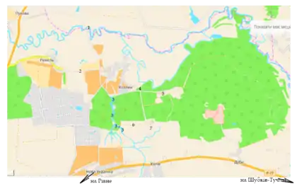 - 6. Південна окраїна села Козлин — місце відмобілізування 13 АК (штаб у м. Рівне).