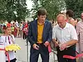 Сільський голова О. Лазарєв та голова райдержадміністрації Р. А. Михайлич перерізають стрічку