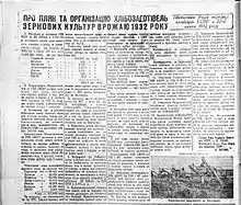 Згідно першої п'ятирічки, українське сільське господарство мало перейти від виключної орієнтації на зернові до більш різноманітної продукції. Це передбачало збільшення посівів цукрового буряку і культур, які будуть використані у промисловості (наприклад бавовнику, який вирощувався з 1931 року). У цій п'ятирічці передбачалось зменшення посівних площ зернових і збільшення площ для посіву інших культур, підвищення врожайності. 1 липня 1931 року 65,7 % господарств і 67,2 % орних земель були «колективізовані». Площі, де вирощувались важливі культури — зернові й цукровий буряк, були колективізовані на 80-90 %[9]