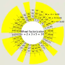 - Наступні набори є що означає, що вона починається з 3 для всіх непарних чисел з усуненими множниками 2 (окружність 2),має усунені фактори 2 та 3 (окружність 6), як для початкового базового колеса у наведеному вище прикладі тощо.