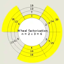 - Знайти перші кілька простих чисел, які ляжуть в основу колеса факторизації. Вони є відомими або, можливо, визначені з попередніх застосувань коліс меншої факторизації або шляхом швидкого пошуку їх за допомогою сита Ератостена .