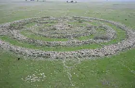 Рештки складаються з великого кола (злегка овального) з базальтових гірських порід, всередині якого є чотири невеликі концентричні кола, кожне з яких стає все тоншим; деякі з них завершені, інші неповні.[12] Стіни кола з'єднані нерівномірно розкиданими невеликими кам'яними стінами, перпендикулярними до кіл.[12]