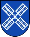 - Також значного поширення набули млинові водяні колеса (з лопатами), колесоподібний кам'яний жорновий камінь (позначений млинним залізом на ступиці) та вітрове колесо (без ободів). Їх можна знайти в гербах, оскільки це символізувало широке поширення млинів і важливість поставок збіжжя. Видатна споруда (млин) у безпосередній близькості від села також зробила його точкою орієнтації з великих відстаней. Лопаті вітряка мають у форму Андріївського хреста. Використання гідроенергії для промислового зростання спонукало багато громад задокументувати свій прогрес і наявне багатство, маючи водяне колесо на своєму гербі. У разі водяних коліс річковий або млинний канал також часто відображається у різних формах представлення води.