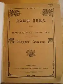 - Колесса Ф. Українські народні думи : перше повне вид. з розвідкою, поясненнями, нотами і знімками кобзарів / д-р Філярет Колесса. — Львів : Накладом Т-ва ”Просвіти”, 1920. — 160, VIII, 4 с. : табл., ноти, 8 арк. іл. — (Загальна бібліотека ”Просвіти”).