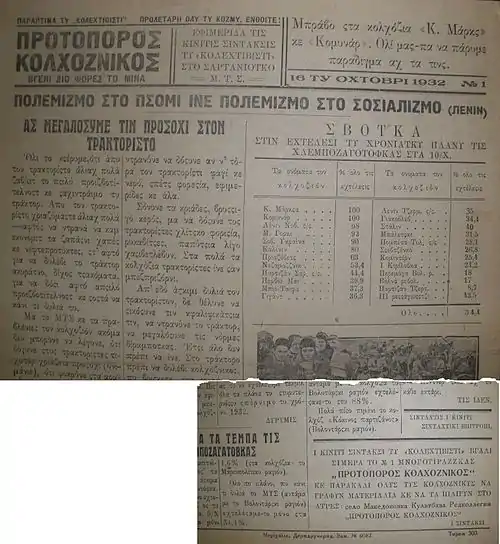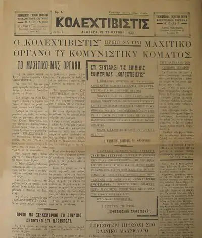 Перше число «Колехтивістиса» вийшло 27 жовтня 1930 року, але цьому передувала поява в маріупольській окружній газеті «Наша правда» додатку «Ελινικί ςελίδα» — «Грецька сторінка». Перша така сторінка вийшла 27 серпня 1930 року, і цей день можна вважати за початок румейського друку. «Грецьких сторінок» з’явилося лише чотири: незабаром припинилося видання окружної газети у зв’язку зі скасуванням округів і переходом до районно-обласної системи адміністративного поділу. Але тут якраз і почав виходити «Колехтивістис».