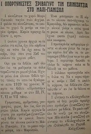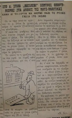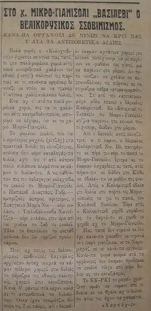 | Стаття про перепони в елінізації школи в селі Стила з карикатурою (20 τυ μαι 1931, αριθμ. 22 (34), ς. 2) | «У с. Малоянисоль „панує“ великоросійський шовінізм» (про елінізацію шкіл) (5 τυ ιυνι 1931, αριθμ. 25 (37), ς. 2) | «Опортуністи зривають (ςριβαγιυτ!) елінізацію в Малому Янісолю» (15 τυ ςεπτεβρι 1931, αριθμ. 45 (57), ς. 2) |