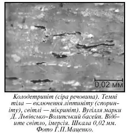 У порівнянні з колотелінітом в колодетриніті відсутня структурна цілісність і він має менш виражений шаруватий характер. К. – суміш вітринітових частинок крупністю менше 10 мкм і аморфної вітринітової речовини. К. містить більше субмікроскопічних неорганічних речовин, ніж інші вітринітові мацерали. Разом з тим, на відміну від вітридетриніту частинки компонента не виразно видні під оптичним мікроскопом в зв'язку з високою мірою гомогенізації; К. має тонкозернисту поверхню, особливо у суббітумінозному і бітумінозному вугіллі з високим виходом летких. Шліфований розріз, виконаний перпендикулярно до площини нашарування, показує К. як шари різної товщини. Паралельно до нашарування К. виглядає як плями неправильної форми. У молодому вугіллі К. може мати пористу поверхню і внутрішні плями. По мірі збільшення ступеню вуглефікації стає все важче розпізнати колодетриніт і колотелініт. Присутність К. в антрациті пояснюється тим, що К., який має власну морфологію, перемішаний з інертодетринітом. Після травлення зразка помітна тільки відшліфована частина К., яка називається криптовітродетринітом.